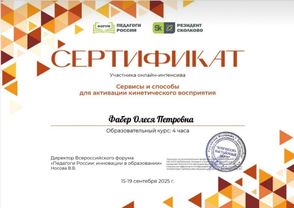 Сертификат участника онлайн-интенсива " Сервисы и способы для активации кинетического восприятия" курс 4 часа 2025г