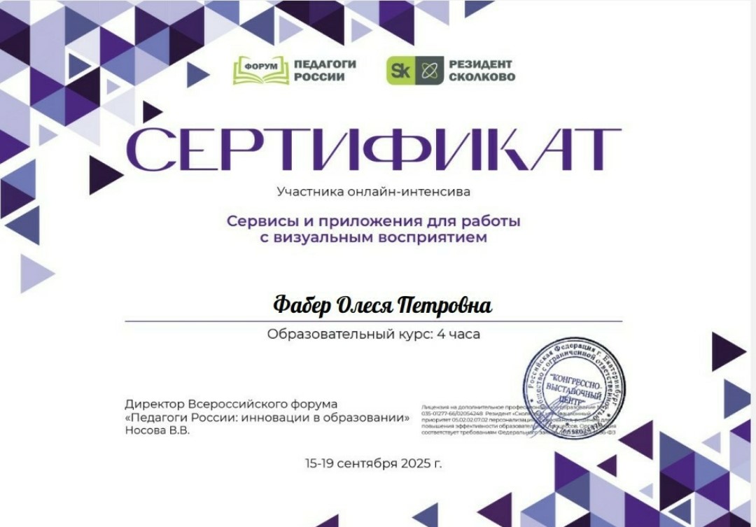 Сертификат участника онлайн-интенсива "Сервисы и приложения для работы с визуальным восприятием курс 4 часа 2025г