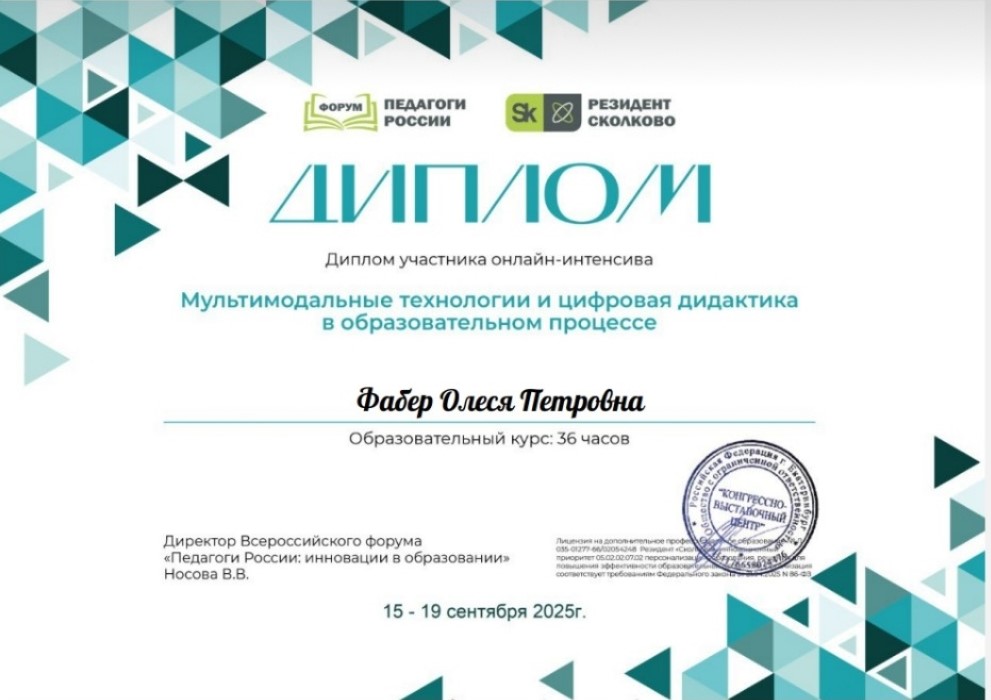 Диплом участника онлайн-интенсива "Мультимодальные технологии и цифровая дидактика в образовательном процессе" курс 36 часов 2025 г
