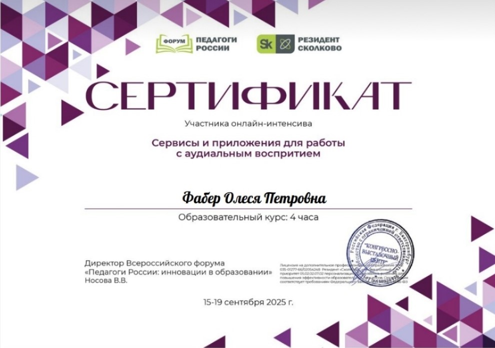 Сертификат участника онлайн-интенсива "Сервисы и приложения для работы с аудиальным восприятием" курс 4 часа 2025г