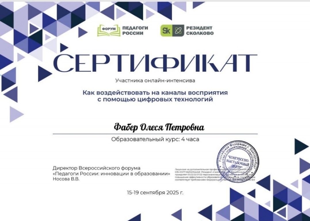 Сертификат участника онлайн-интенсива "Как воздействовать на каналы восприятия с помощью цифровых технологий" курс 4 часа 2025г